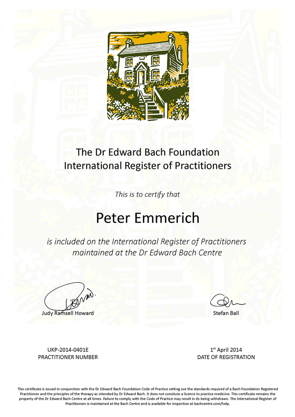Im März 2014 legte ich den letzten Teil der Prüfung am Bach Centre ab und bekam angeboten in das internationale Register der Bach Foundation als BFRP - Bach Foundation Registered Practitioner - aufgenommen zu werden. Ich unterwarf mich dem Code of Practice und wurde am 01.04.2014 in das Register aufgenommen.